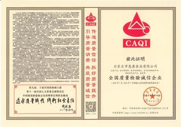 石家庄市惠康食品有限公司再传捷报,在中国质量检验协会组织开展的2023年全国“质量月”企业质量诚信倡议专题活动中,深耕食品制造行业近30年的惠康食品,凭借过硬的产品质量连续两年被被授予“全国质量检验诚信企业”。