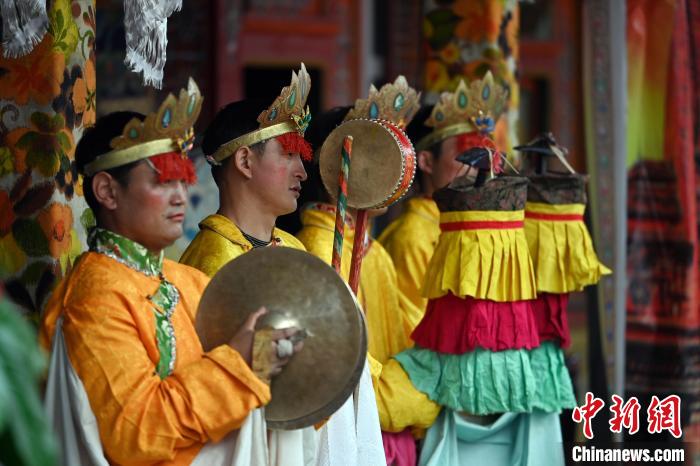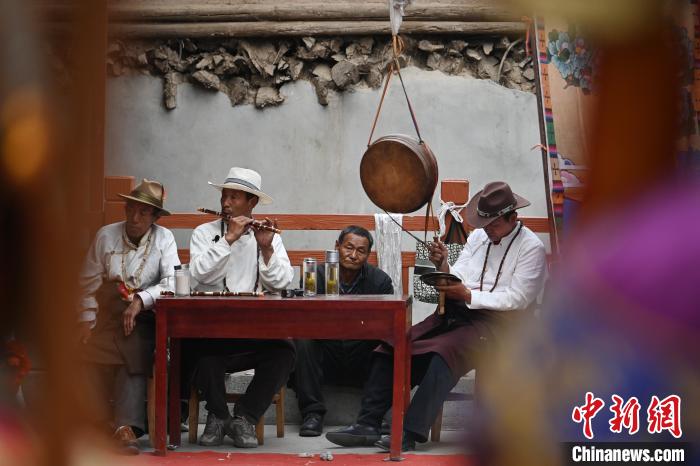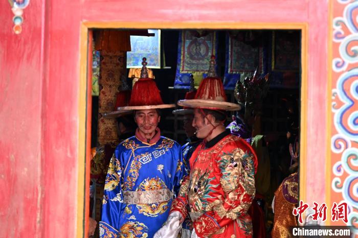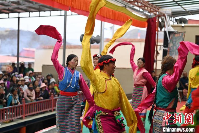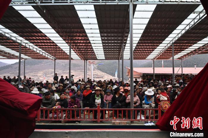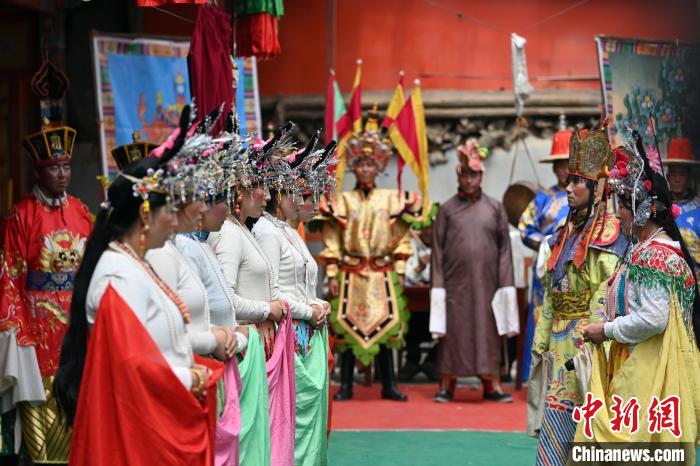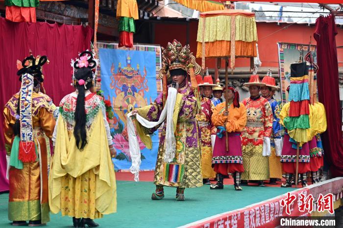 5月7日,在甘肃甘南藏族自治州碌曲县双岔镇二地村,当地村民演绎传统八大藏戏之一的‌《诺桑王子》‌。中新社记者 九美旦增 摄
