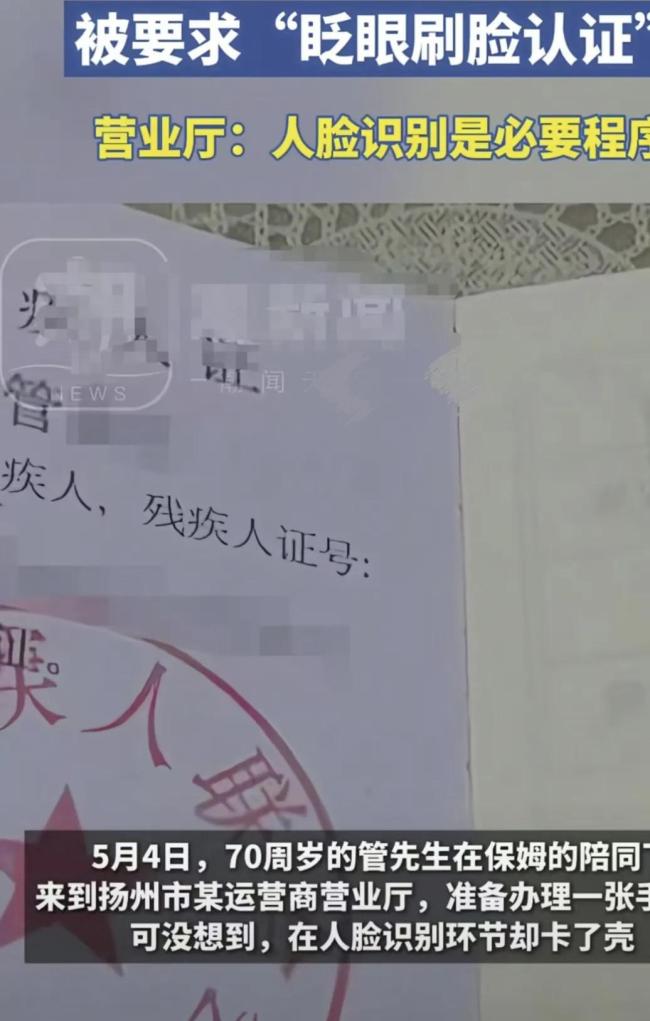 据媒体报道,5月4日,江苏70岁的管老先生在保姆的陪同下来到扬州市某运营商营业厅,准备办理一张手机卡,但在人脸识别环节遇到了问题。管先生因眼球缺失,双眼无法睁开,成为盲人。事发当天他未携带残疾证,但眼部残疾状况肉眼可见。