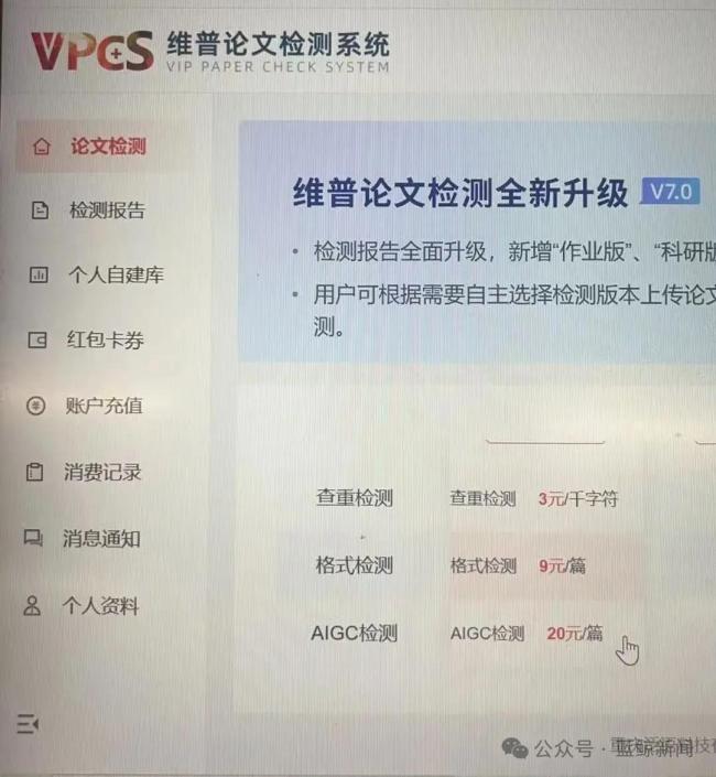 蓝鲸记者查询发现,知网、维普、PaperPass等网站均推出了AIGC检测服务。其中知网AIGC检测为2元/千字符;维普则为一口价20元/篇;PaperPass则为“查重+AIGC检测”的打包定价1.5元/千字符。