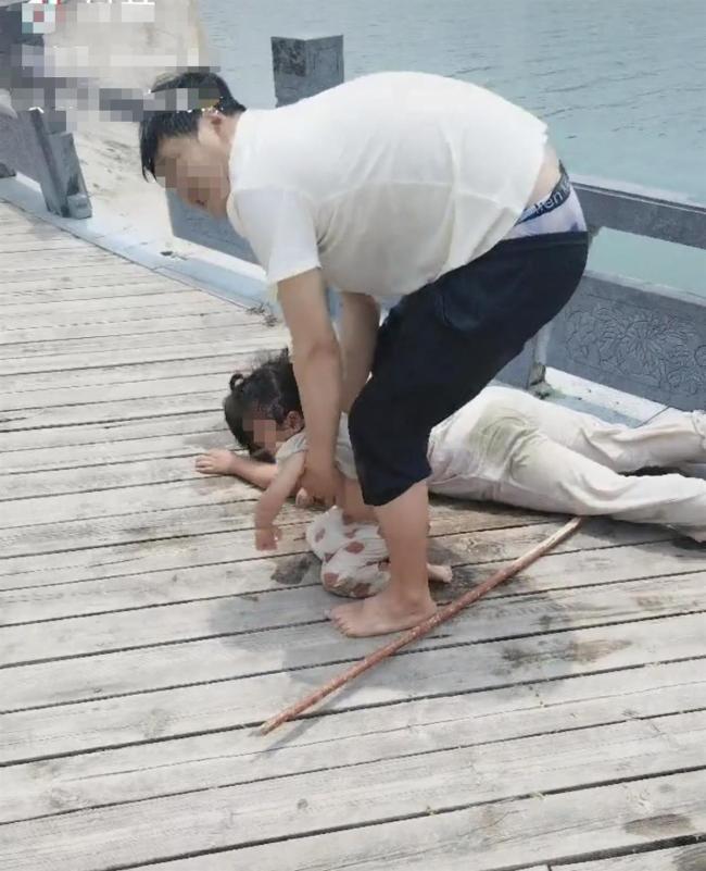 周文强靠近岸边时听到落水男子不停高喊“救人!快救人!”,发现除了男子,还有一名女子和一个三岁左右的小女孩也在水里。由于落水地点是一个观景台,离水面有一定高差,周文强赶紧找了一根木棍递给落水男子,随后和其他人一起把男子拉了上来。