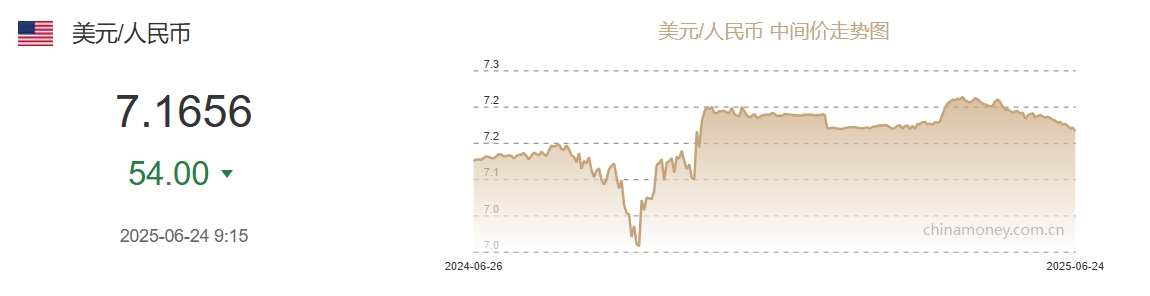 6月24日人民币对美元中间价报7.1656元 上调54个基点
