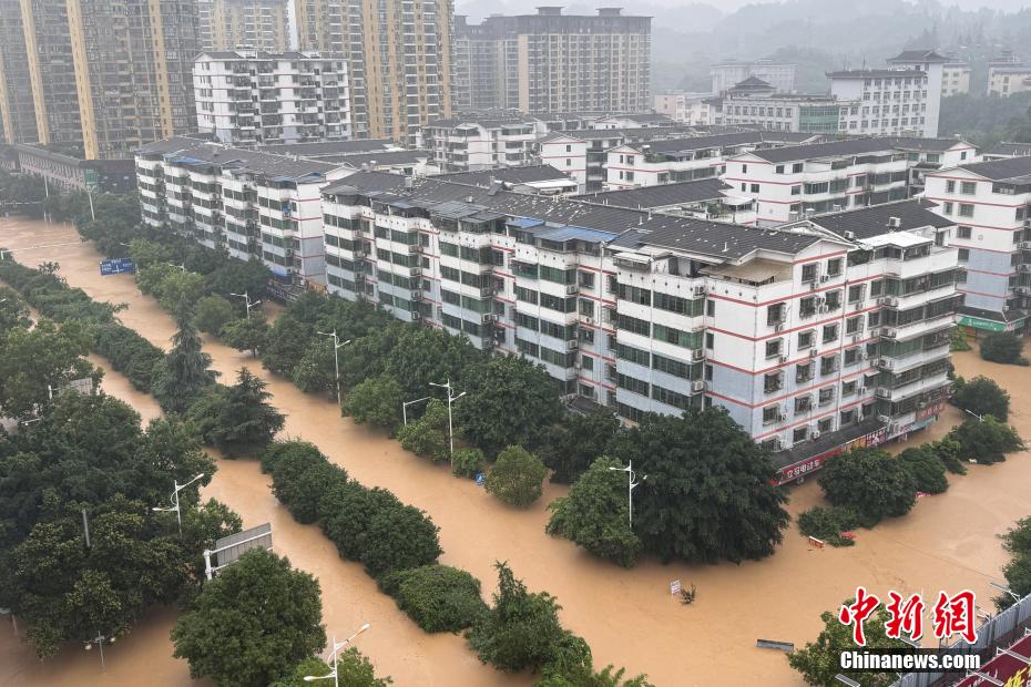6月23日至24日,贵州省黔东南州榕江县遭遇持续性强降雨。当前,县内平永河、寨蒿河、都柳江水位持续快速上涨。图为6月24日,榕江县城道路被淹。中新社记者 袁超 摄