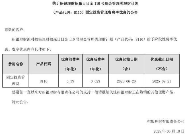 具体来看,进入6月,招银理财的多款产品下调了固定投资管理费率。以一款90天持有期的固收类理财产品为例,该产品的固定投资管理费率从优惠前的0.2%(年化)下降至0.01%(年化),但优惠时间仅为1个月。而其他多款现金管理类理财产品的固定投资管理费则从0.3%(年化)下调至0.02%(年化)。从招银理财披露的产品信息显示,截至2024年年末,其固定收益类理财产品的存续金额为2.4万亿元,占管理产品总规模的97.35%。