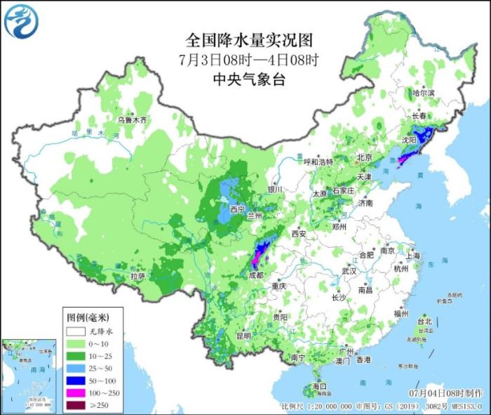 中新网7月4日电 据中央气象台网站消息,昨日,我国依然保持着四川盆地至华北、东北多降水,黄淮及以南地区高温范围广的状态。其中云南中西部、四川盆地西部、青海东北部、甘肃中部和东南部、陕西西南部、山西东南部、河北西部、辽宁东部和南部、吉林东南部等地出现大到暴雨,四川盆地西部、辽东半岛大暴雨,四川绵阳、德阳、成都局地特大暴雨(250~354毫米);黄淮至华南北部出现大范围高温天气,日最高气温达到37℃以上的区域涉及河南、山东、安徽、江苏、浙江、江西等地。