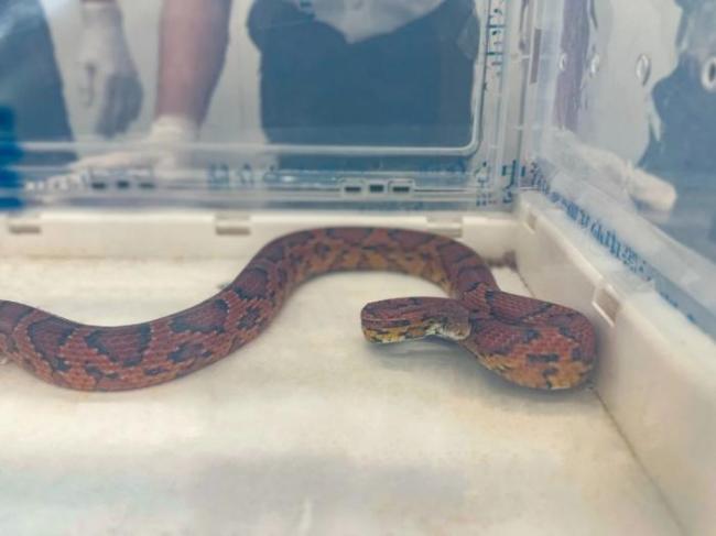 近日,皇岗海关在福田口岸旅检进境渠道查获一名旅客携带一条外来物种玉米锦蛇的案件。事发当日,海关关员在福田口岸旅检大厅对进境旅客及行李物品进行监管时,注意到一名推着婴儿车进入海关监管区的旅客未向海关申报且神情异常。随后,关员引导该旅客到查验区进一步检查。经仔细查验,在婴儿车靠背后方发现了一条用丝袜包裹的活体蛇。经深圳海关动植物检验检疫技术中心鉴定,确认该条活体蛇为玉米锦蛇,属于外来物种。