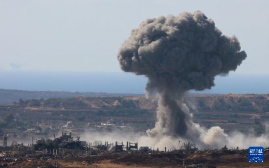 这是7月7日从加沙边境以色列一侧拍摄的加沙地带被毁建筑。新华社发(吉尔·科恩·马根摄)