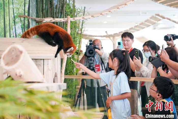 图为小朋友与小熊猫互动。中新社记者 赵宇航 摄