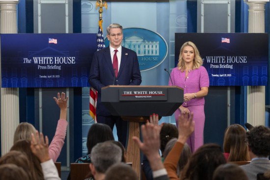4月29日,美国白宫新闻秘书卡罗琳·莱维特(右)与美国财政部长斯科特·贝森特在华盛顿白宫出席记者会。新华社记者胡友松摄