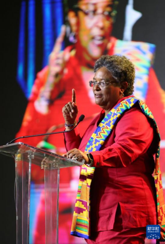 7月6日,在牙买加蒙特哥贝,加共体卸任轮值主席、巴巴多斯总理莫特利在加共体政府首脑会议开幕式上致辞。新华社记者 李梦馨 摄