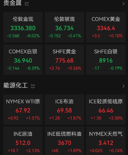 而在贵金属市场方面,黄金价格则表现相对谨慎,维持窄幅震荡。伦敦现货黄金小幅下跌,最新报价为每盎司3336.38美元,略微承压。与此同时,CMOEX黄金期货价格小幅上涨0.1%,报3346.4美元/盎司。分析人士认为,当前全球经济环境复杂多变,一方面避险情绪升温支撑金价,但另一方面美元走强、美债收益率波动,也令黄金短线承压,市场多空力量暂时僵持,金价陷入盘整格局。