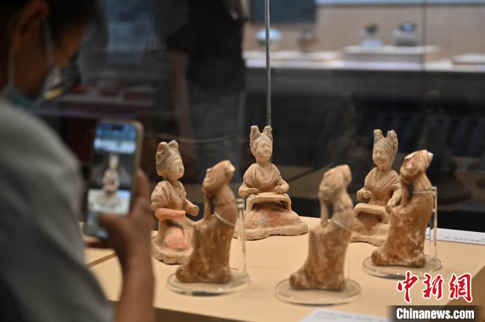 图为彩绘陶女舞俑、伎乐俑吸引参观者拍照。中新社记者 陈楚红 摄