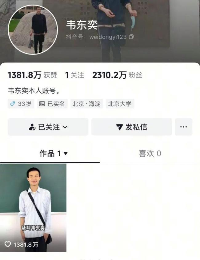 高考前夕,韦东奕在社交平台上开设了个人账号,并发布了一条时长仅为4秒的视频,短时间内吸引了大量关注,截至6月9日10时30分许,他的粉丝数量已突破2310万。