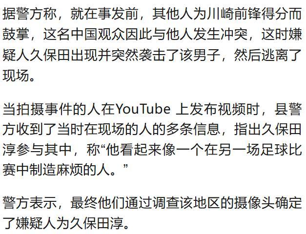 殴打中国球迷的日本男子被捕 比赛现场暴力事件!日本神奈川县警方近日宣布,已逮捕埼玉县河口市的土木工程工人久保田淳(53岁),他涉嫌在观看亚洲冠军联赛精英足球比赛时袭击并重伤一名观众,造成严重伤害。