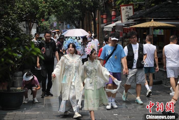 7月15日,四川成都,游人走在窄巷子。时下正值暑期旅游旺季,成都市宽窄巷子景区迎来众多游客前来游玩、打卡。中新社记者 王磊 摄