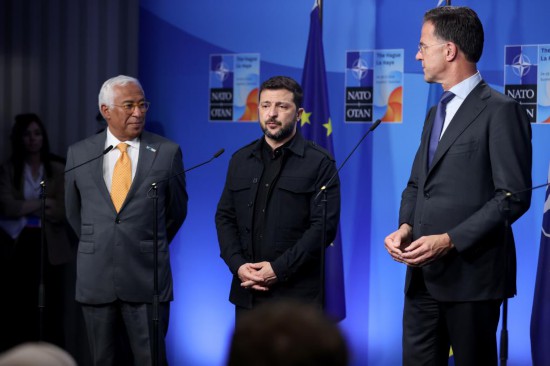 6月24日,在荷兰海牙,乌克兰总统泽连斯基(中)在北约峰会期间对记者讲话。新华社记者赵丁喆摄