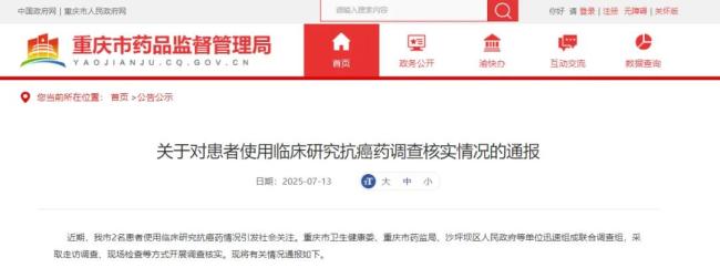 7月13日,重庆市卫健委、重庆市药监局、沙坪坝区人民政府等联合调查组发布《关于对患者使用临床研究抗癌药调查核实情况的通报》。(以下简称《通报》)