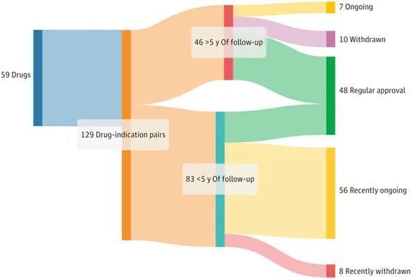 129个药物适应症中,46个随访时间超过5年的适应症(2013-2017年批准)。其中,29个(63%)转为常规批准,10个(22%)被撤回,7个(15%)在加速批准后的中位6.3年仍未有明确结局。