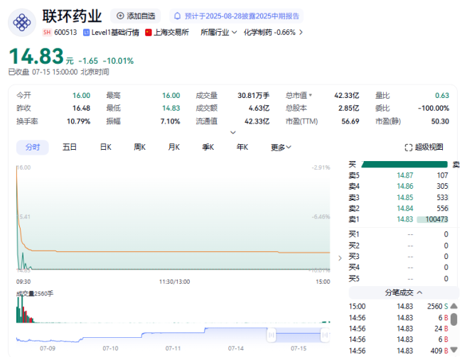7月15日,联环药业(600513)低开低走,盘中跳水跌停。