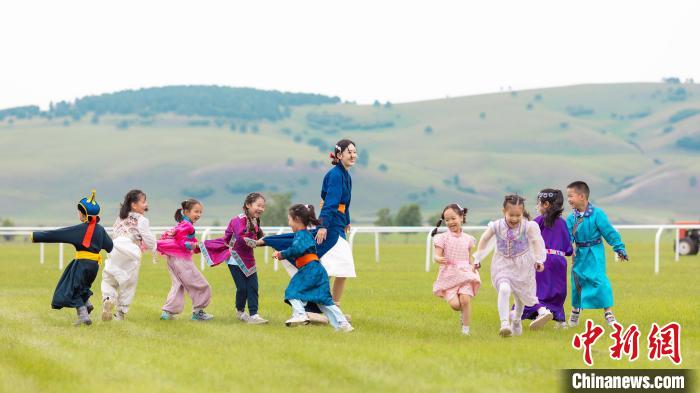 6月29日,内蒙古呼伦贝尔,在鄂温克族自治旗巴彦嵯岗苏木音乐节上,幼儿园教师带领身着现代元素蒙古袍的学生参加活动。索米亚 摄