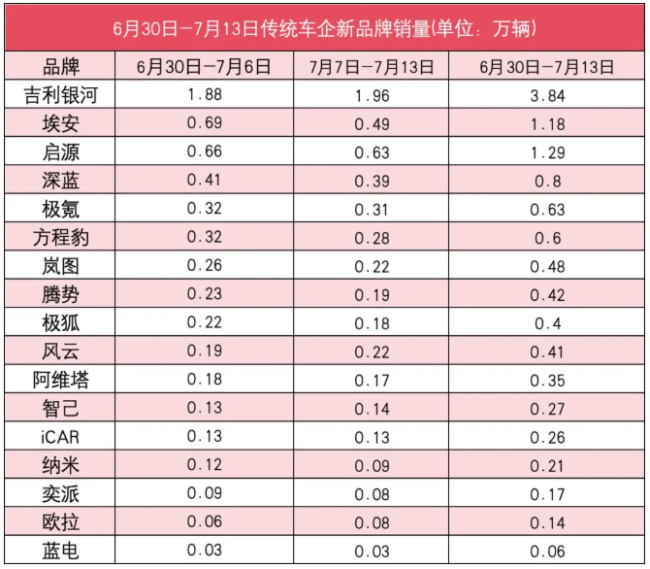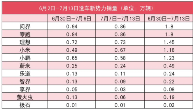 理想继续排在第三位。7月7日-7月13日,理想销量为0.73万辆,较前一周增长了0.01万辆;6月30日-7月13日,理想累计销量为1.45万辆。理想近期正在为即将在月底上市的i8做预热工作,这是一款6座纯电SUV车型。这一细分市场近期可以说非常热闹,除了i8外,还有乐道L90、问界M8纯电版。还有消息称,加长的Model Y六座版车型已经下线,这些车型都与i8构成直接竞争关系。理想的纯电第二战,面临的压力还是不小。