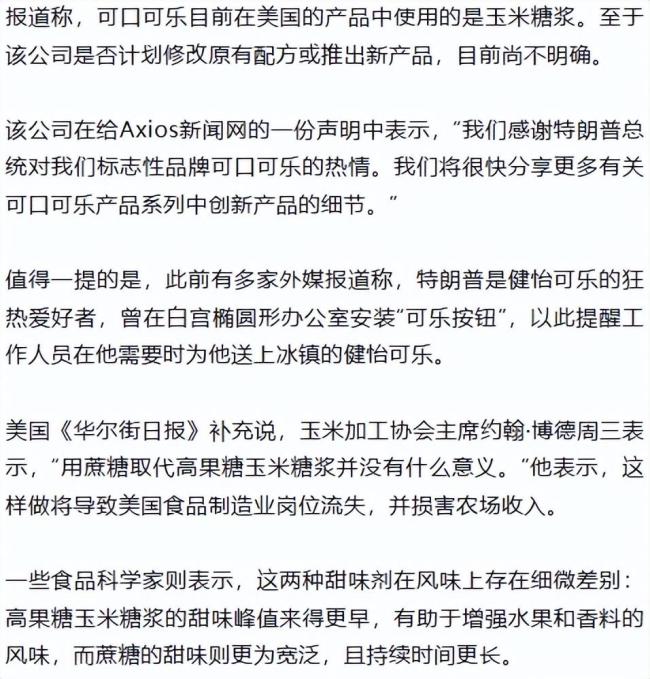 特朗普让可口可乐改配方 使用蔗糖生产可乐
