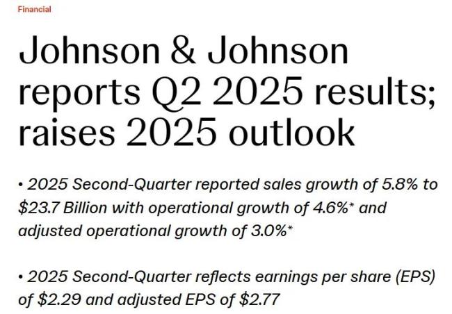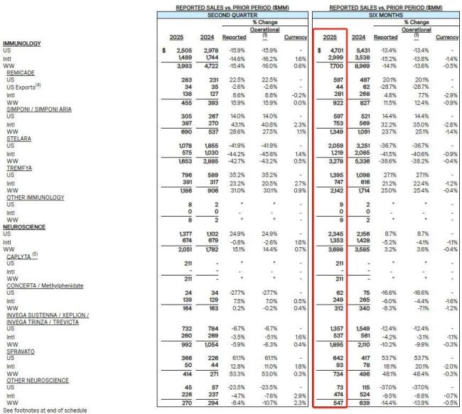 无独有偶,强生也在前一天发布2025年半年报:其创新制药和医疗科技两大核心业务板块共同创造了高达456.36亿美元的营收,同比增长4.1%。其中,创新制药板块为强生带来290.75亿美元的收入,同比增长3.6%。