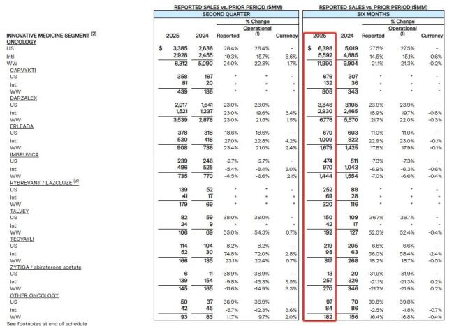 作为全球首个获批上市的CD38单抗,Darzalex已成为全球多发性骨髓瘤临床治疗的核心产品,上半年创收67.76亿美元,同比增长21.7%,独自撑起了强生肿瘤板块销售额的“半壁江山”,再度超出业界预期。