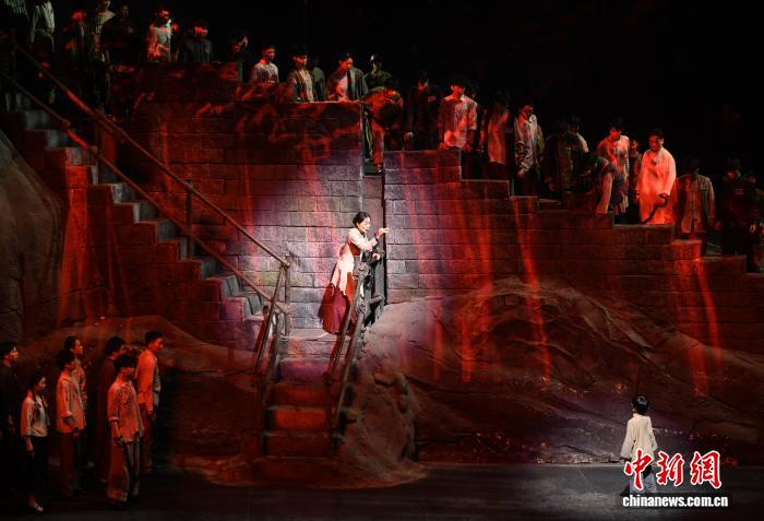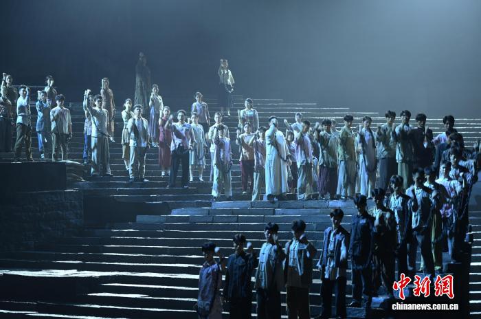 7月21日晚,19个国家和中国港澳台地区的26家华文媒体来到位于重庆市沙坪坝区的重庆1949大剧院,欣赏大型红色舞台剧《重庆·1949》,感受艺术与科技融合的视听盛宴。据介绍,《重庆·1949》舞台剧以1949年重庆解放前夕为大背景,讲述了众多被关押在渣滓洞、白公馆的中国共产党人经受住种种酷刑折磨,不折不挠、宁死不屈的故事。图为演出现场。中新社记者 周毅 摄