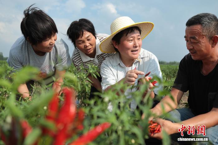 图为梁芳芳(右二)在辣椒地与农户交流。李新义 摄