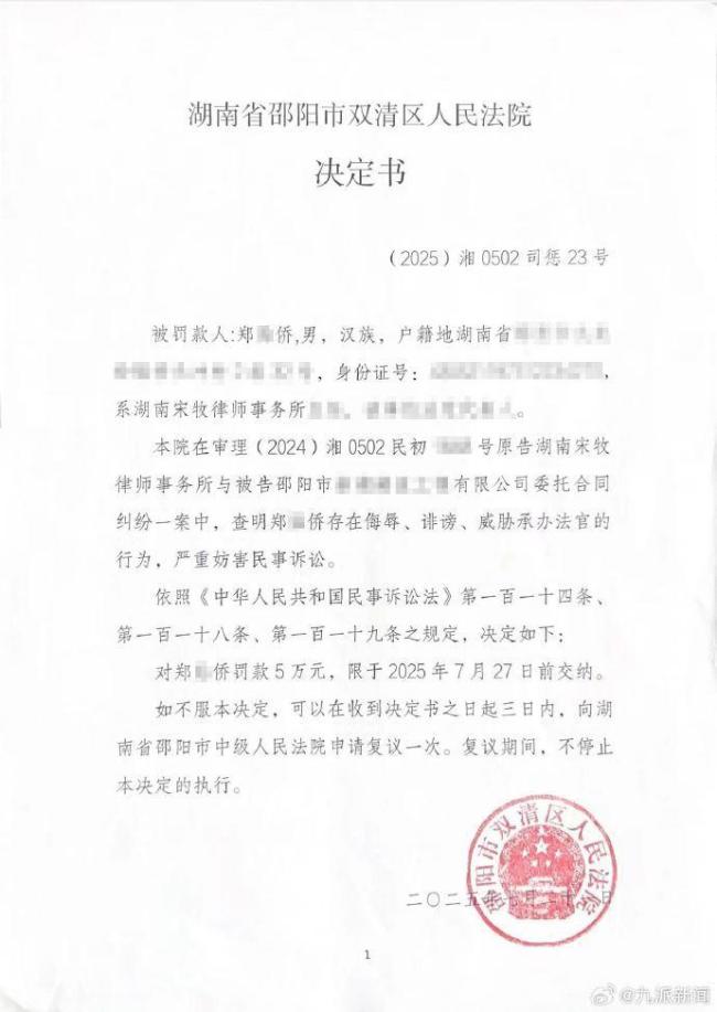 法院通报律师侮辱办案法官 恶意误导舆论受罚。7月21日,湖南省邵阳市双清区人民法院发布声明,指出湖南宋牧律师事务所及该所律师郑某侨在抖音、微博和微信群中持续发布视频,故意歪曲事实,恶意误导舆论,对法院办案法官进行侮辱和诽谤。这些行为严重妨害了民事诉讼,损害了司法权威,并造成了恶劣的社会影响。经过批评教育,郑某侨认识到自己的错误并表示道歉。考虑到他主动删除了不实视频,并承诺不再发布相关视频和信息,法院根据《中华人民共和国民事诉讼法》的相关规定,决定对其罚款5万元。
