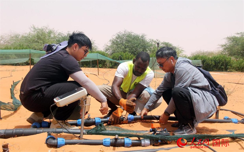 灌溉技术工人穆罕默德·伊塞勒穆蹲在沙地里,熟练地更换着电磁阀智能控制喷淋阀门组件——这是他去年就已经掌握的技能。他说:“中国的同事们来自中国的新疆,当地自然环境和我们这里近似。有中国同事的帮助,我相信这里一定能发展起绿色种植。”