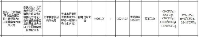其中,桃李粮油旗舰店(经营者为天津桃李食品有限公司)在抖音(手机APP)销售的、标称北京市桃李食品有限公司委托山东桃李面包有限公司生产的醇熟切片面包,其中菌落总数不符合食品安全国家标准规定。