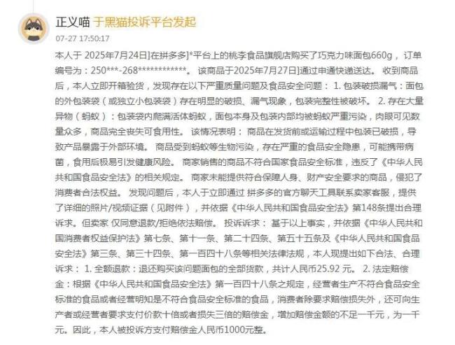 黑猫投诉显示,7月27日,一位消费者投诉称,7月24日在某购物平台上的桃李食品旗舰店购买了巧克力味面包660g。该商品于2025年7月27日通过申通快递送达。收到商品后,本人立即开箱验货,发现存在以下严重质量问题及食品安全问题:1.包装破损漏气:面包的外包装袋(或独立小包装袋)存在明显的破损、漏气现象,包装完整性被破坏。2.存在大量异物(蚂蚁):包装袋内爬满活体蚂蚁,面包本身及包装内部均被蚂蚁严重污染,肉眼可见数量众多,商品完全丧失可食用性。