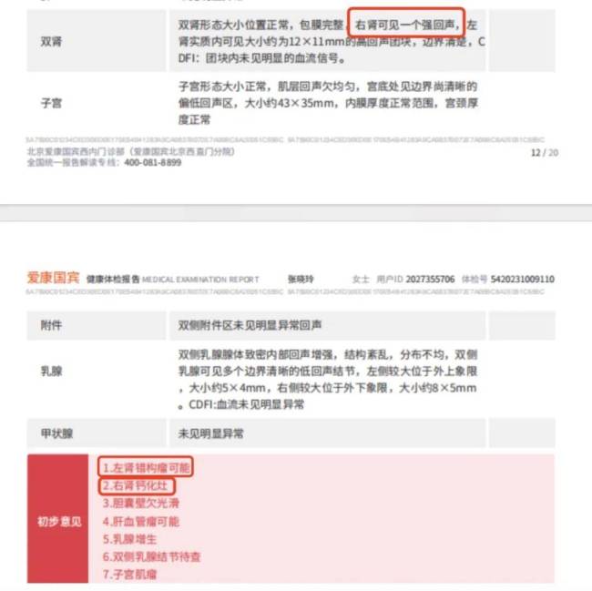 在说明会上,爱康国宾公布了张女士2023年10月9日在北京爱康国宾西内门诊部参加体检的部分报告,显示肾钙化灶和肾错构瘤可能。经过内部核查和外部专家分析,确认对张女士的肾脏检查不存在瑕疵,报告结论与实际情况一致,没有漏诊或误诊。