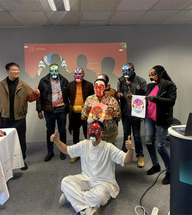 随后进行的中国京剧脸谱绘画制作体验将现场气氛推向了高潮。志愿者教师冯泽魁用京剧脸谱解读中国颜色符号,关羽之红、典韦之黄、窦尔敦之蓝,与南非国旗色块遥相呼应。在冯泽魁、杨煜两位老师的带领下,学员们提笔上色,十余分钟后,一张张“中南融合脸”诞生。“这简直太有趣了!中国戏曲中的颜色居然这么富有意义!今天的开班仪式内容丰富精彩、有趣且令人激动愉悦。我和我的同事们都迫不及待想要学习中文!”莫迪莎(Mandisa)说道,今天她为了参加此次活动还特意穿戴了富有中国文化气息的服饰。“我要把它挂在办公室,提醒自己下周五的中文课绝不能缺席。”学员乔巧(Jojo)手持刚完成的“彩虹关羽”兴奋地说。