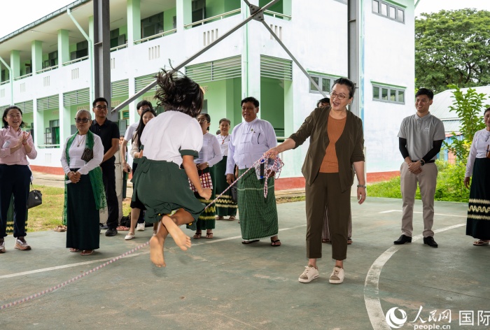 马珈与内比都第14中学学生互动。人民网记者 谢佳君摄