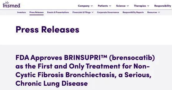 而就在前一天,Insmed宣布其DPP-1抑制剂Brensocatib(商品名:Brinsupri)获FDA批准上市,用于治疗12岁及以上儿童和成人NCFBE,成为该疾病领域首款靶向治疗药物。