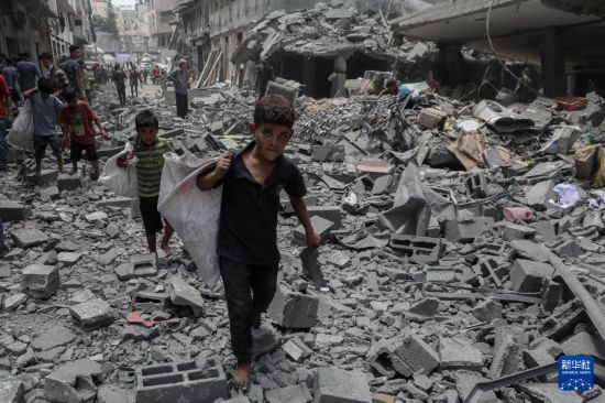 8月8日,孩子们在加沙城以军袭击后的废墟上搬运物品。新华社发(里泽克·阿卜杜勒贾瓦德摄)