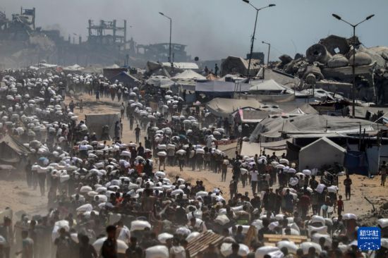 7月27日,在加沙地带北部城镇拜特拉希亚,人们领取通过边境口岸进入加沙的援助物资。新华社发(里泽克·阿卜杜勒贾瓦德摄)