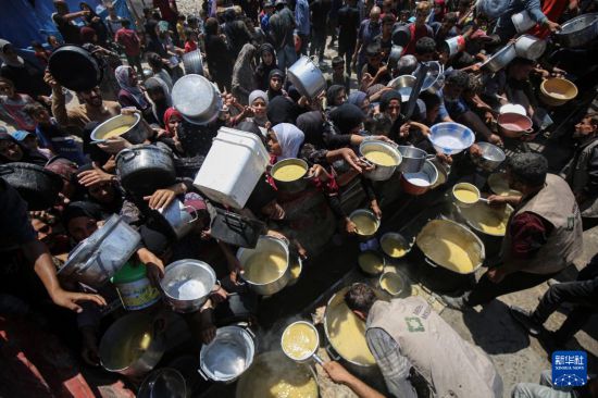 8月10日,流离失所的巴勒斯坦人在加沙城西部等待领取食物。新华社发(里泽克·阿卜杜勒贾瓦德摄)