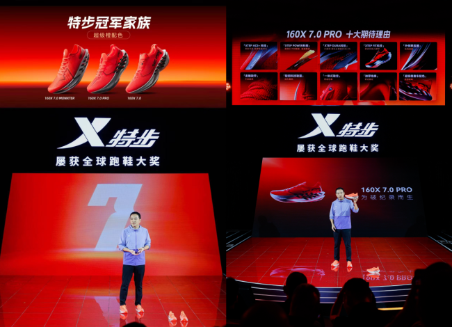 特步跑步品类高级总监陆一嘉介绍,特步160X 7.0 PRO是采用一体式轻韧科技鞋面设计,让鞋面弹性、包裹性、透气性、速干等各个维度达到更佳效果;XTEP DURA科技,使大底止滑性能提升38.5%;“黄金碳板”GT700,推进力对比上一代提升8%;中底搭载全新升级的XTEP ACE+科技,双密度组合设计,上层42度优化脚感,下层45度支撑和回弹,确保全马42.195公里全程回弹持久性。