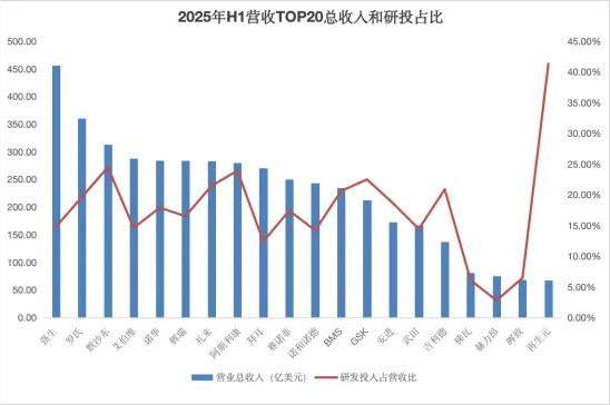整体来看,2025年H1财报,全球药企研发投入占营收比普遍“收缩”,TOP20中逾半数下调研投占比,BMS大幅削减,罗氏连续三年下行,吉利德密集裁撤管线止损。行业的隐形共识正在从押注增长切换向守住效率,并购似乎也由动辄百亿的大单,转向更可控的多笔小单。