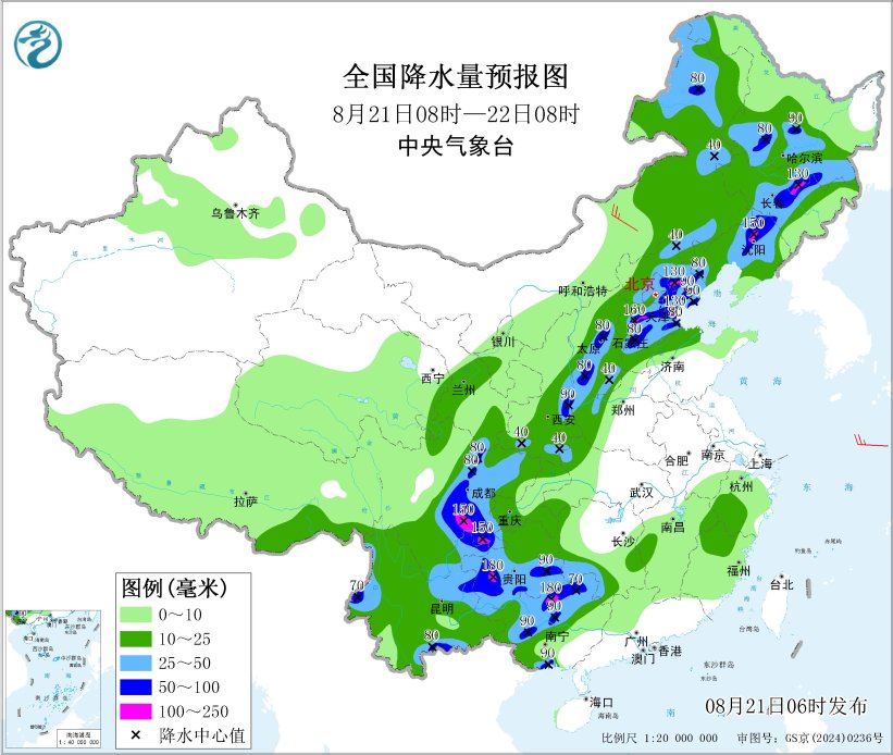 8月21日08时至22日08时,内蒙古东部、东北地区大部、西北地区东部、华北大部、山东中北部、河南西部、西南地区大部、华南西部等地部分地区有中到大雨,其中,内蒙古东北部、黑龙江中南部、吉林中部、辽宁中北部、陕西中部、山西中部、河北中南部和东北部、北京东部、天津中北部和南部、四川盆地西部和南部、贵州西部和南部、云南、广西西南部和北部等地部分地区有暴雨,局地大暴雨(100~180毫米)。内蒙古中东部有4~6级风,东海北部海域将有5~7级风、阵风8级,北部湾将有5~6级风、阵风7级。