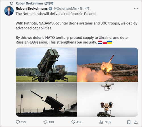 当地时间8月20日,荷兰代理国防大臣鲁本・布雷克尔曼斯在社交平台X上宣布,荷兰将向波兰提供防空系统,并在波兰境内部署约300名军人,以强化北约防御并保障对乌克兰的军事供应安全。布雷克尔曼斯表示,荷兰将在波兰部署爱国者防空导弹系统、地对空导弹系统、反无人机系统以及300名军人,以投入先进作战能力,既能保卫北约领土,也能保障对乌克兰的物资供应。