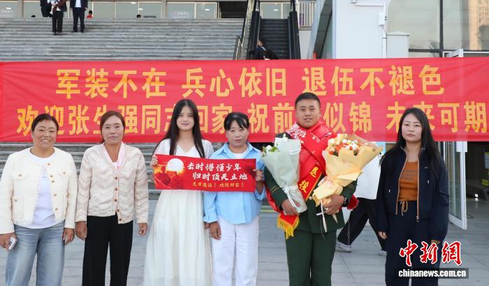 9月1日,青海西宁,武警青海总队一名退伍老兵(右二)与亲友在西宁火车站合影。中新社记者 马铭言 摄
