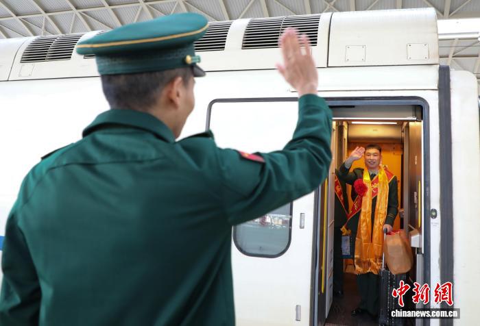 9月1日,青海西宁,武警青海总队机动某支队一名退伍老兵在列车车厢内向战友挥手告别。中新社记者 马铭言 摄