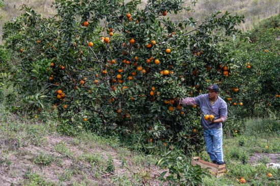 8月19日,在巴西里约热内卢州坦瓜市,一名橙农采摘橙子。每年8月至9月,巴西各地橙园进入收获季节。巴西是全球最大的橙汁生产国和出口国之一,在国际市场上占有重要地位,其产品远销世界各地。新华社记者王天聪摄