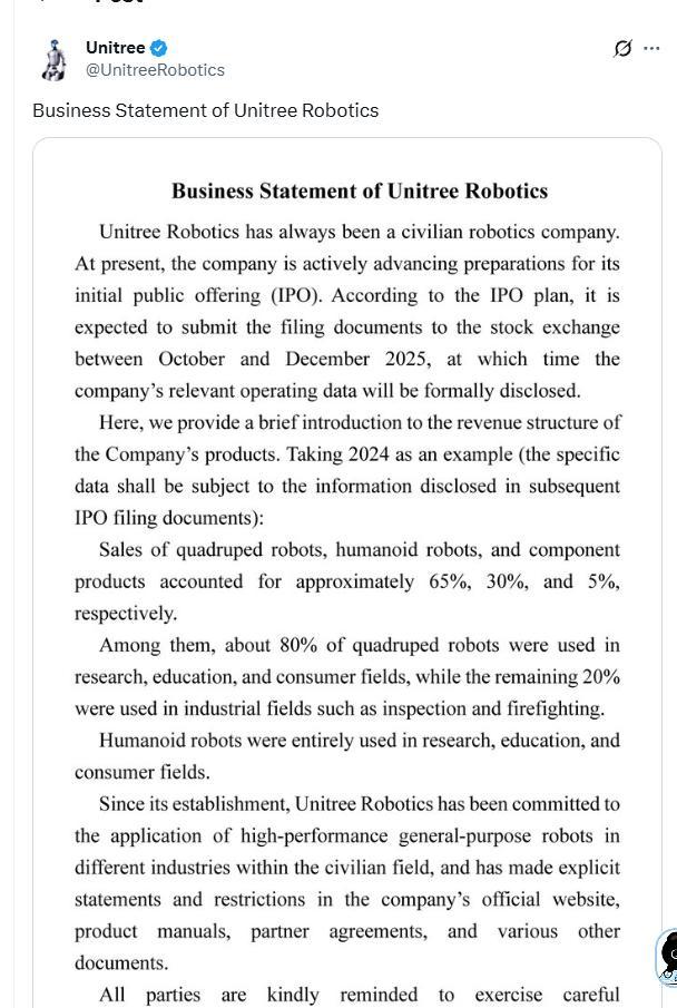 宇树科技四季度递交上市申请 筹备IPO稳步推进!宇树科技宣布正积极筹备首次公开募股(IPO)。9月2日,公司在社交媒体平台X上发帖称,预计在2025年10月至12月期间向证券交易所提交备案文件,届时将正式披露公司的相关运营数据。