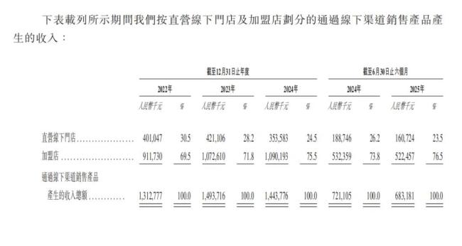 公司的一半收入来自加盟商。2022年至2024年及2025年上半年,公司分別有1033名、1202名、1252名及1228名加盟商,加盟商销售产生收入分别占比50.2%、50.6%、50.9%和49.1%。
